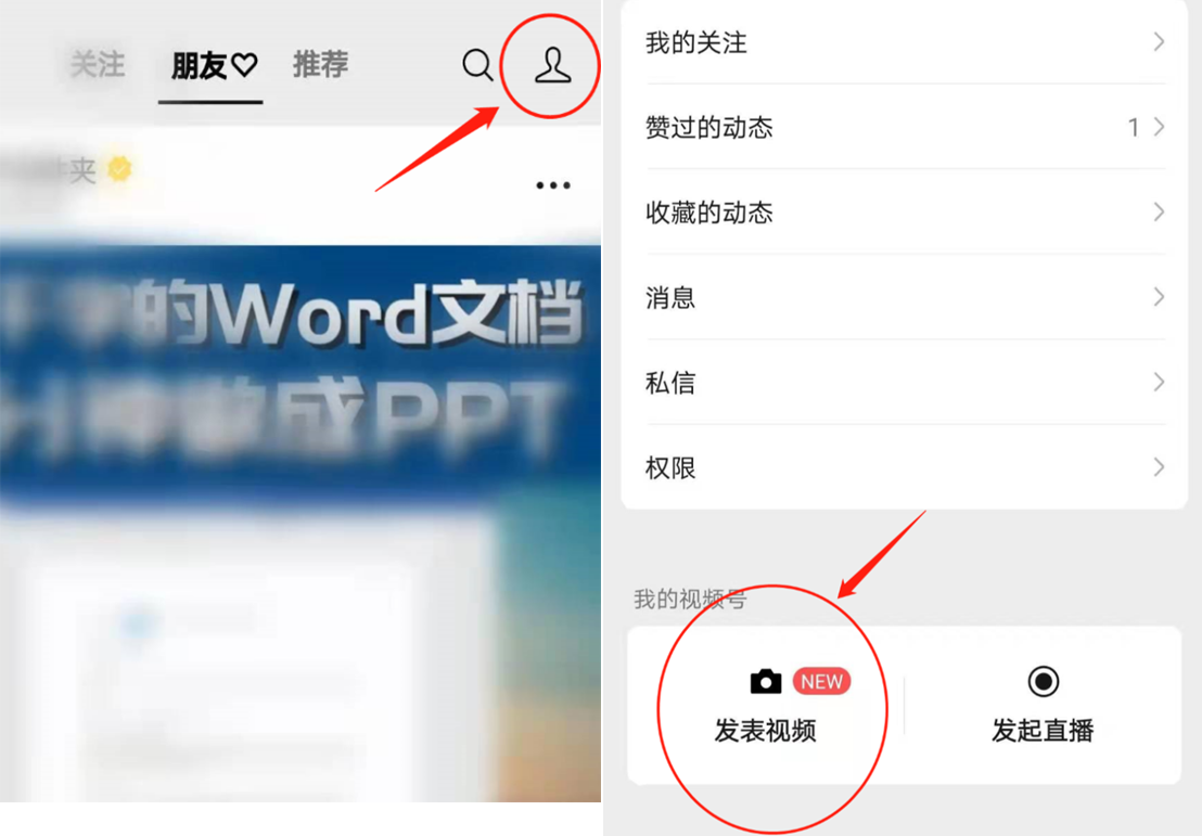 第三步;待进入视频号后,点击右上角的【人物】图标,并选择【发表视频】