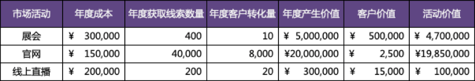 例子中,展会是最贵的,也产生了质量最高的线索(每位客户价值有50万),但每年的销售额只有500万。同时网站的成本只有一半,线索质量很低(每个客户价值只有2500元),但每年有两千万的销售额。最后, ezway易利官网登录 比网站的线索质量高,但产生的活动价值很低,企业在这个情况下就需要重新考虑对 ezway易利官网登录 的投入了。