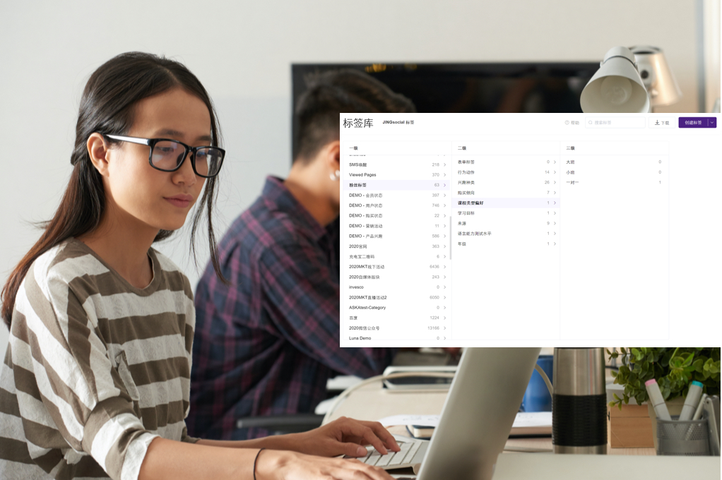标签是用户画像的重要组成元素,也是您后续进行人群筛选的重点维度。 多层级标签:支持普通标签和动态标签,最多支持8个层级,设置生效条件后,无需手动便可自动打上标签,对潜客做更精细的筛选。 标签管理:潜客在微信、企微、营销活动页面等多个环境行动均可被打上标签,您也可以在标签库实现多层级标签及规则的批量管理。